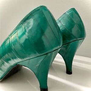 Step out in style with these elegant emerald green heels. Perfect for any occasion, they offer both comfort and fashion. Hand-made of eel skin. Extremely comfortable. Great condition.