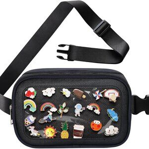 Features: Stylish belt bag with a transparent TPU panel to display your pins, plus two large compartments with mesh pockets for organizing small essentials. Includes a convenient zipper pocket on the back for valuables. The adjustable strap makes it comfy for different waist sizes or wearing crossbody.