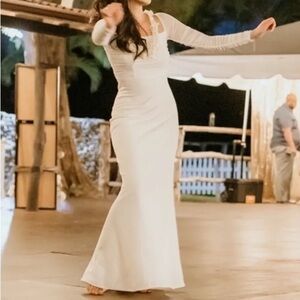 Lulus Elegant Eternity White Mesh Ruched Off-the-Shoulder Maxi Dress! This trendy twist on the classic bridal look features stretchy sheer mesh (atop a matching knit liner) that shapes a ruched bodice and an off-the-shoulder neckline with hidden no-slip strips, all framed by long ruched sleeves. The high, fitted waist tops a figure-skimming, crepe knit skirt that cascades down to a sweeping maxi hem with a dramatic train at the back. Hidden back zipper/clasp.