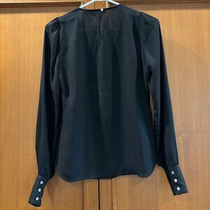 Elevate your wardrobe with this stunning black blouse from Carmen Marc Valvo. Featuring elegant long sleeves and a high neckline, this top is beautifully accented with an intricate, jeweled embellishment around the collar—no necklace needed! Perfect for holiday parties, evening outings, or dressy office wear.