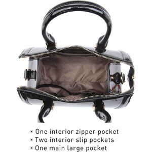 Features: This chic faux leather satchel is perfect for elevating your everyday style. It’s crafted from vegan leather with a sleek, polished look. The adjustable long shoulder strap allows you to wear it crossbody or over the shoulder, making it super versatile. With a thoughtful layout, it has two open interior wall pockets for your essentials and a zippered back wall pocket for extra security. The top zipper closure and studded flat bottom add a touch of sophistication, while gold-tone hardware keeps it stylish.