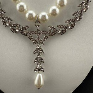 This sophisticated necklace features faux pearls and rhinestone detailing, perfect for formal occasions or bridal wear. The drop pearl pendant adds timeless elegance.