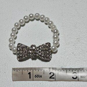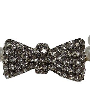 This bracelet features a delicate string of faux pearls with a sparkling rhinestone bow centerpiece. A sophisticated addition to any jewelry collection, it offers a touch of elegance to both formal and casual outfits. Lightweight at just 0.6 oz, it's comfortable for everyday wear.