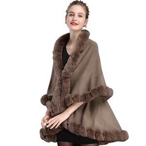 Elegant Faux Fur Trimmed Layered Shawl/Cape Coat