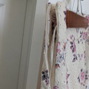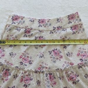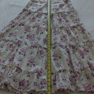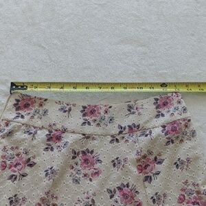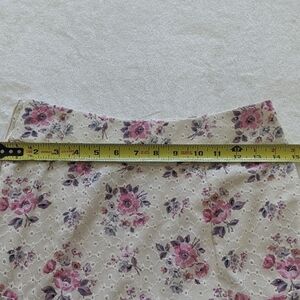 Step out in style with this fully lined elegant A-line skirt, featuring a charming floral design in cream and purple eyelet. Perfect for any occasion. Included measurements of waist and hip area as this fits someone with more narrow hips. It is a size small, however the fabric is not stretchy.