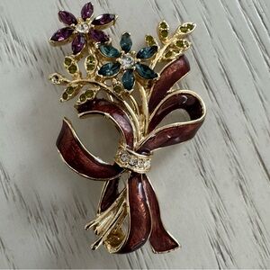 This exquisite brooch features a stunning floral design with purple and green accents, perfect for adding a touch of elegance to any outfit.