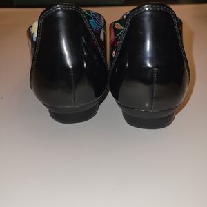 These elegant flats feature vibrant floral embroidery on a sleek black base, perfect for any occasion.