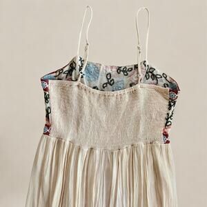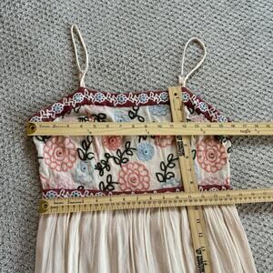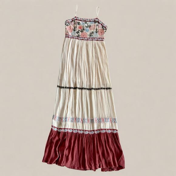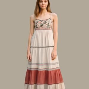 This elegant maxi dress features intricate floral embroidery and a flowing design. The cream and red colors create a stunning contrast, perfect for any occasion.