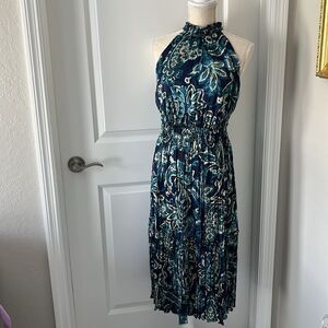 Step out in style with this elegant floral halter dress. Featuring a stunning blue and green pattern, this dress is perfect for any occasion. The halter neckline adds a touch of sophistication.