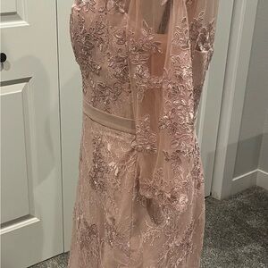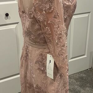 This elegant floral lace dress features long sleeves and a sophisticated dusty rose hue, perfect for any special occasion.