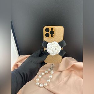 Make a statement with this exquisite iPhone case, designed for the fashion-forward. The beige leather texture is adorned with delicate embossed roses, complemented by a bold white floral centerpiece with a black bow. The detachable pearl handle adds both functionality and sophistication, making this case a perfect blend of style and practicality