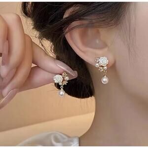 Elegant Floral Pearl Zirconia Stud Earrings, Bouquet Crystal Accent Earrings