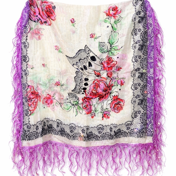 Add a touch of elegance with this floral scarf featuring a vibrant purple fringe. Perfect for any occasion.