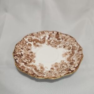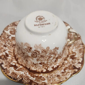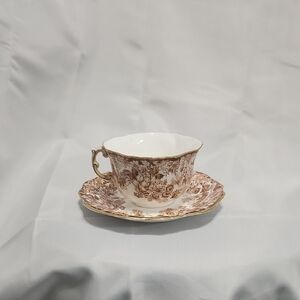 Beautiful teacup and saucer with intricate floral design. Features a rich brown and white pattern.
