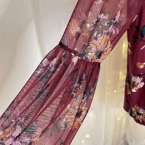 Elevate your wardrobe with this elegant burgundy blouse, adorned with a stunning floral design. Perfect for any occasion.