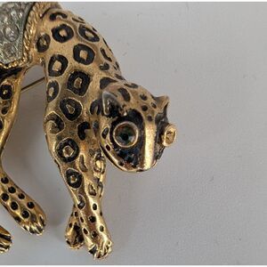 This stunning gold leopard brooch features intricate crystal accents, perfect for adding a touch of elegance to any outfit. A must-have accessory for animal lovers.