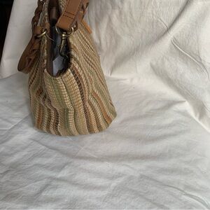 Elevate your style with this elegant tan and brown striped shoulder bag. Perfect for any occasion, its chic design adds a touch of sophistication to your ensemble.