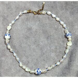 This elegant necklace features freshwater pearls and porcelain floral beads, creating a sophisticated accessory for any occasion. Perfect for adding a touch of elegance to your outfit.