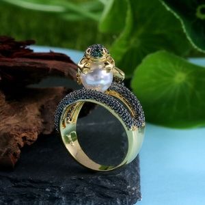 This exquisite ring features a unique frog design adorned with sparkling green and black stones. The gold band adds a touch of luxury, making it a standout piece for any occasion.