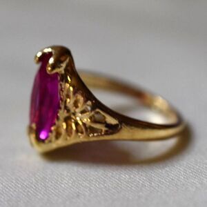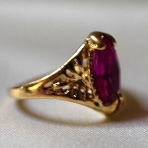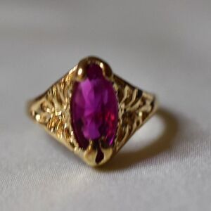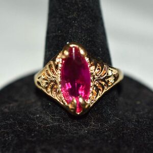 Elegant Fuchsia Beveled Oval Inset Stone Filigree Gold Tone Metal Size 10.5 Ring