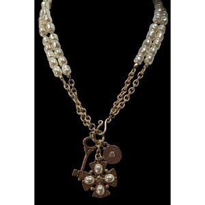 This stunning necklace features a faux pearl and hammered gold-tone charm, adding elegance and glamour to any outfit. Perfect for special occasions or everyday wear, this accessory will enhance your style effortlessly.