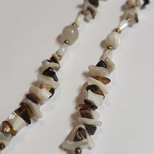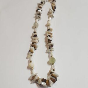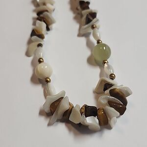 This elegant necklace features a stunning combination of cream, brown, and tan glass stones. Perfect for adding a touch of sophistication to any outfit.