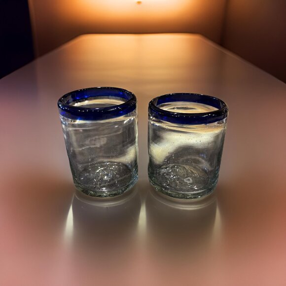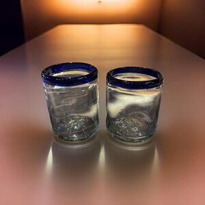 Set of two clear glass tumblers. Features a striking blue rim. Perfect for any occasion.