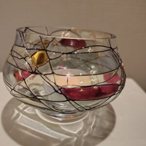 Elegant Glass Art Tealight Holder with Gold and Pink Accents. Y1