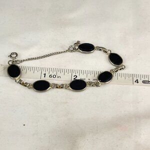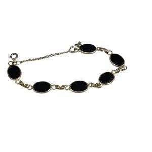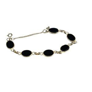 This exquisite bracelet showcases the timeless elegance of black onyx stones set in a sophisticated gold-tone finish. Each oval link is meticulously crafted to enhance the deep, lustrous quality of the onyx, providing a striking contrast against the gleaming gold. The addition of a secure safety chain not only offers peace of mind for everyday wear but also adds a touch of classic charm. This bracelet is a versatile accessory that effortlessly complements both casual and formal attire, making it a treasured addition to any jewelry collection.