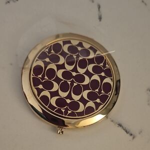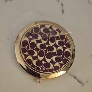 Coach sleek gold and purple compact mirror. Perfect for on-the-go touch-ups. New with bag. Has protective peel off plastic on front and bag.