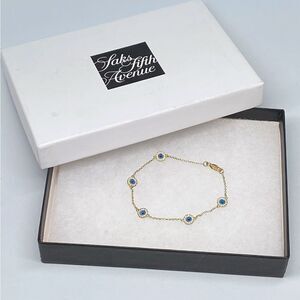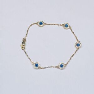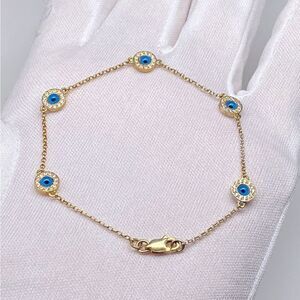 This elegant gold bracelet features striking blue evil eye charms, perfect for adding a touch of protection and style to any outfit.