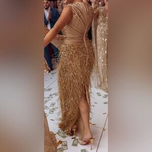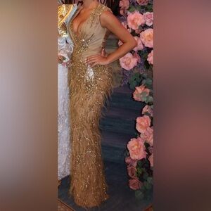 Elegant Gold Feather & Sequin Custom Evening Gown