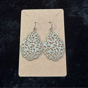 These beautiful teardrop dangle earrings feature an intricate gold-tone filigree design adorned with sparkling clear crystals. Lightweight and eye-catching, they’re perfect for adding a touch of elegance to any outfit. Whether you’re dressing up for a night out or adding a statement piece to your everyday look, these earrings will elevate your style.