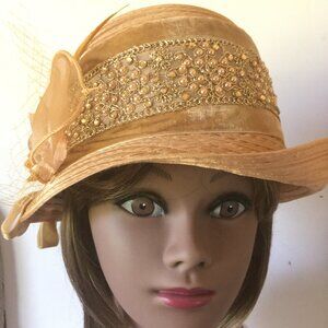 This exquisite gold hat features a structured brim and a crown adorned with intricate rhinestone embellishments, offering a touch of sparkle and sophistication. The elegant fabric draping around the crown adds a soft, flowing element to its luxurious design. Perfect for special occasions, this accessory is a statement piece that exudes elegance and style.
