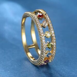 This exquisite gold ring features a stunning array of multi-color gemstones, perfect for adding a touch of elegance to any outfit.