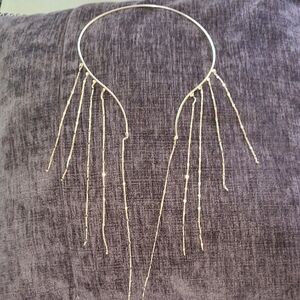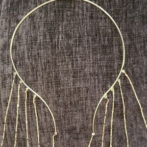 This stunning gold necklace features delicate dangling chains, perfect for adding a touch of elegance to any outfit. Ideal for special occasions or everyday wear.