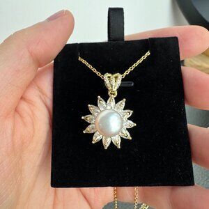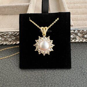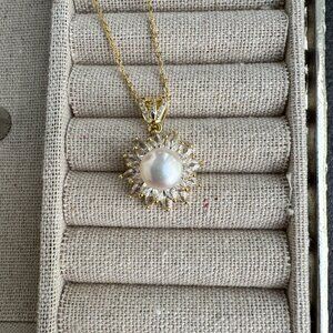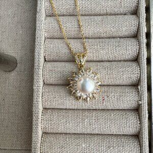 This stunning gold necklace features a radiant pearl centerpiece, perfect for adding a touch of elegance to any outfit. The middle part spins!