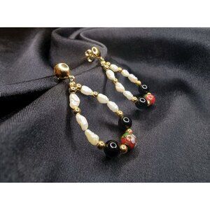 Elegant Gold & Pearl Teardrop Earrings With Black Beads & Red Cloisonné Accents