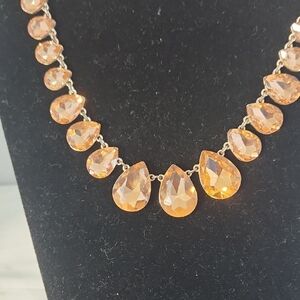 Turn heads with this stunning peach crystal statement necklace! Featuring a beautiful cascade of faceted teardrop and round stones in a soft peachy hue, this piece adds a radiant sparkle and elegant touch to any ensemble.