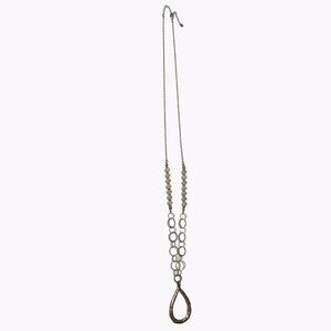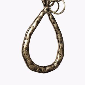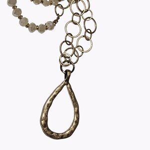 This gold-tone necklace features a textured teardrop pendant, complemented by beads and chain links, offering a stylish addition to jewelry collections.