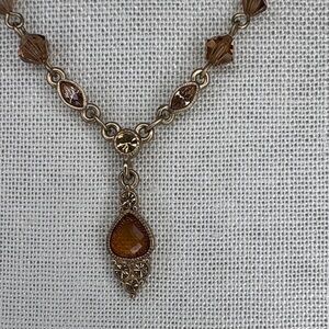 This elegant gold tone necklace features a stunning amber pendant, perfect for adding a touch of sophistication to any outfit.