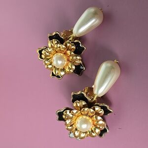 Elegant Gold and Black Enamel Floral Pearl Drop Clip Earrings