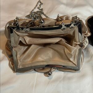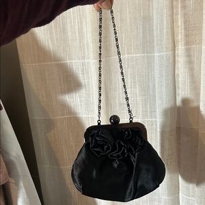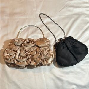 This elegant gold clutch bag features a stunning rose design, perfect for special occasions. Its chic style adds a touch of glamour to any outfit. As is, Final Sale.
