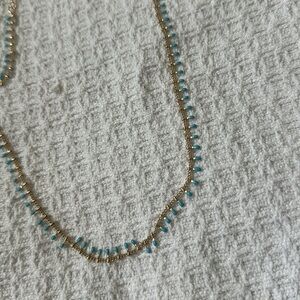 This stunning necklace features a delicate gold chain adorned with vibrant blue beads. Perfect for adding a touch of elegance to any outfit.