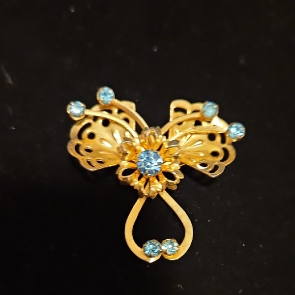 This exquisite butterfly / flower brooch features a stunning combination of gold and blue hues. Perfect for adding a touch of elegance to any outfit. can be worn as a necklace charm.