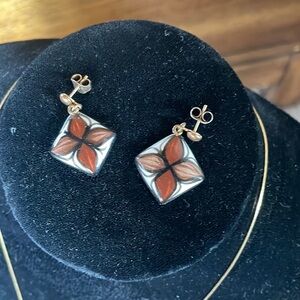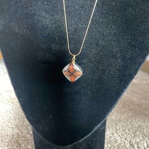 This elegant jewelry set features a stunning gold necklace and matching brown earrings. Perfect for adding a touch of sophistication to any outfit.
