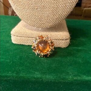 This is a beautiful stretch, ring with gold and Amber and clear crystals. It easily fits up to a size 9.