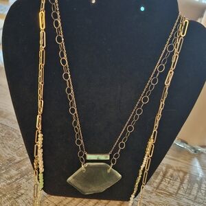This is a combination of three necklaces layered. They can be worn together or separated, and each one individually is really, really pretty. They feature a stunning combination of gold and turquoise tones, perfect for adding a touch of sophistication to any outfit.
