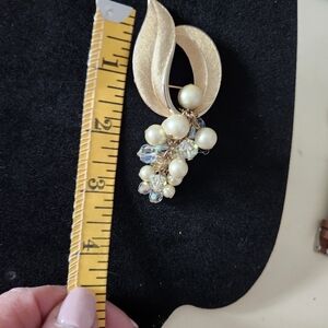 Chic brooch with goldtone setting with pearl and crystal accents.
