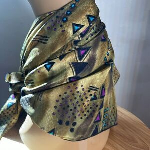Elevate your style with this elegant gold and purple scarf. Perfect for adding a touch of luxury to any outfit. Polyester 44”X44”.
